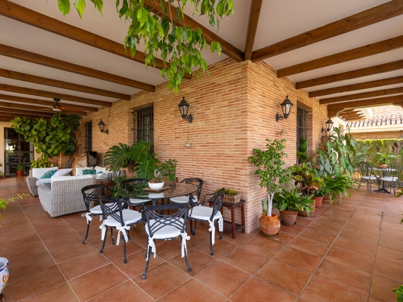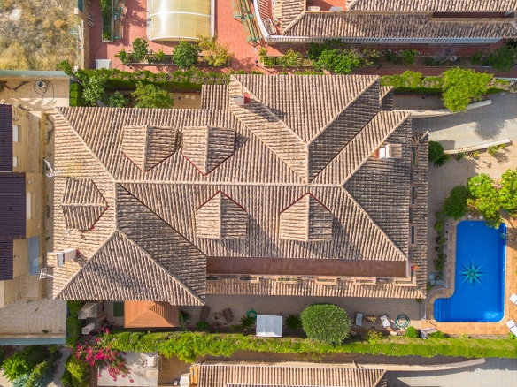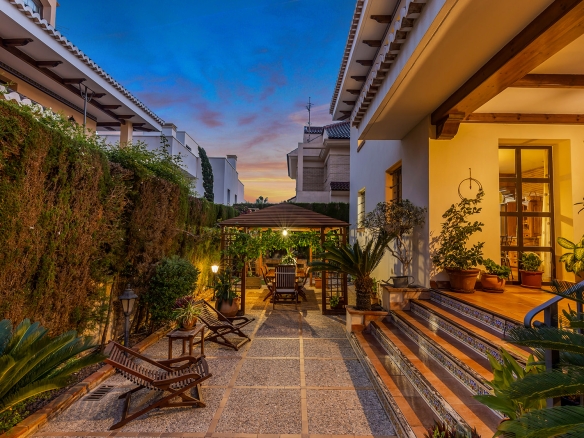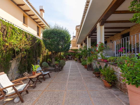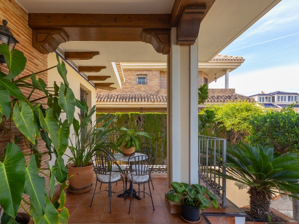 Built on a 700 m² plot, this stunning home offers more than 700 m² of constructed area across several levels, combining elegant Mediterranean architecture with the comfort of a modern home. The exterior features traditional tiled roofs, wooden beams, and spacious terraces surrounded by lush greenery.